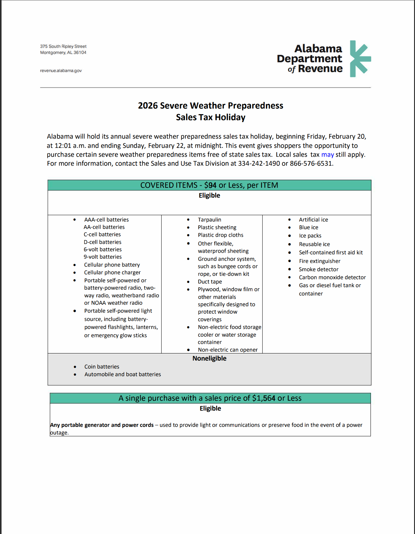 “Severe weather can happen anytime, but preparation can make all the difference,” said Alabama Emergency Management Agency (EMA) Director Jeff Smitherman. “This sales tax holiday is the perfect opportunity to gather the necessary supplies to better prepare your family for the upcoming severe weather season. Being prepared is the first step to building a more resilient Alabama.” Governor Ivey Encourages Alabamians to Prepare for Severe Weather Tax-Free