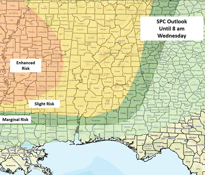 The second threat will be a Mesoscale Convective System (MCS) or large cluster of storms that will reach western Alabama late this afternoon or early evening and move eastward through early Wednesday morning. Damaging wind gusts, hail, and very heavy rainfall are the main threats, although a couple of tornadoes are also possible, mainly in the western sections of the state. There could be pockets of widespread damaging wind gusts with this cluster as it moves through Alabama.