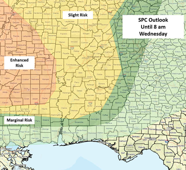 A Mesoscale Convective System (MCS) or large cluster of storms in Arkansas and northern Louisiana at 12:30 pm will reach western Alabama late this afternoon or evening and move eastward through early Wednesday morning. Damaging wind gusts, hail, and very heavy rainfall are the main threats. In addition, a couple of tornadoes are also possible, mainly across the western half of the state. There could be pockets of widespread damaging wind gusts with this cluster as it moves through Alabama.